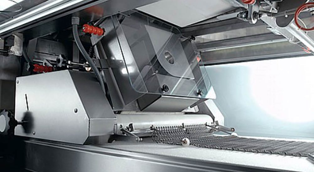 Depositing belt, with realigning roller, deposits products on the retracting table