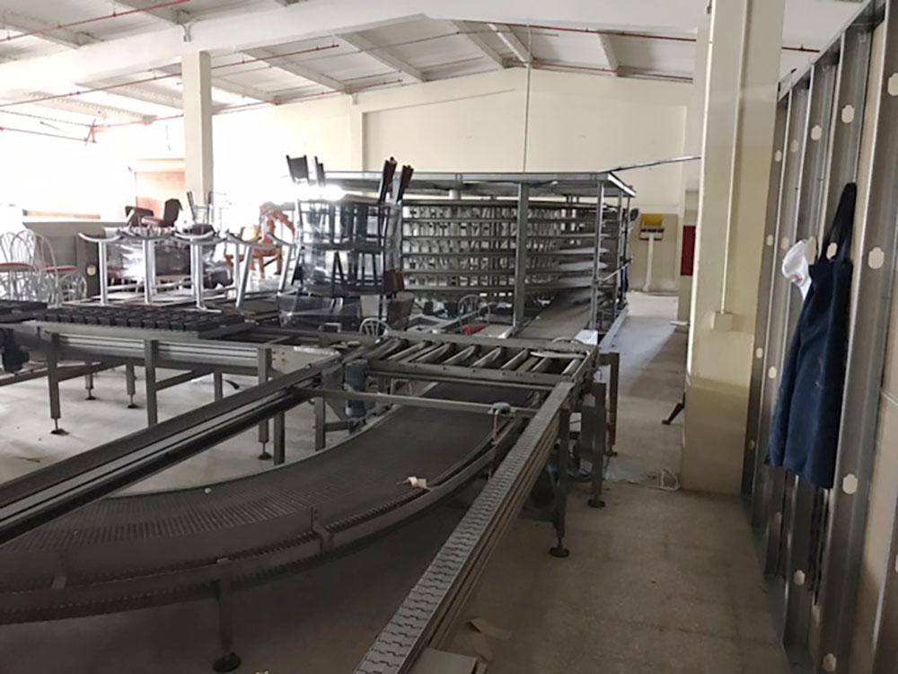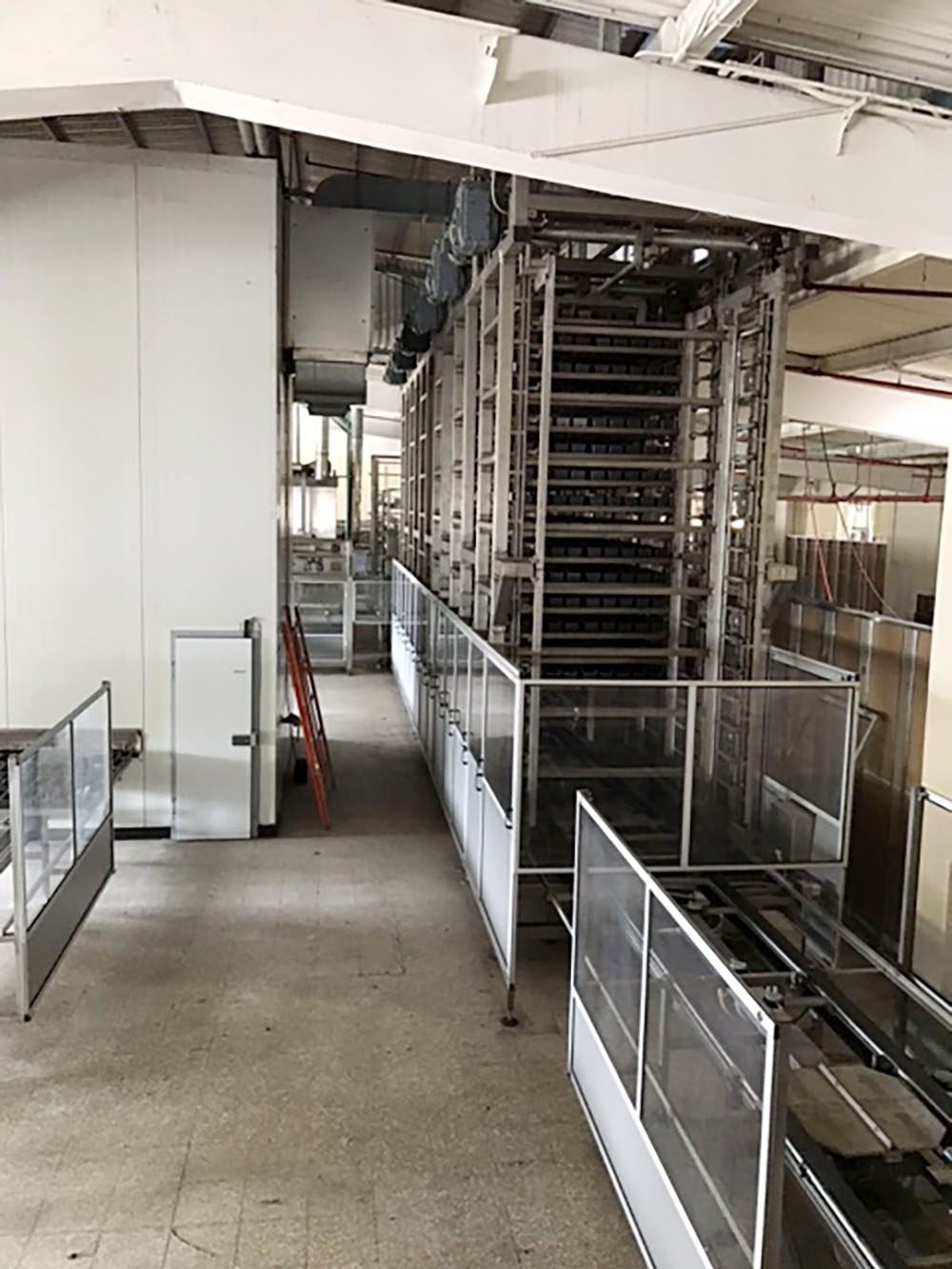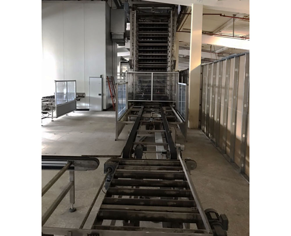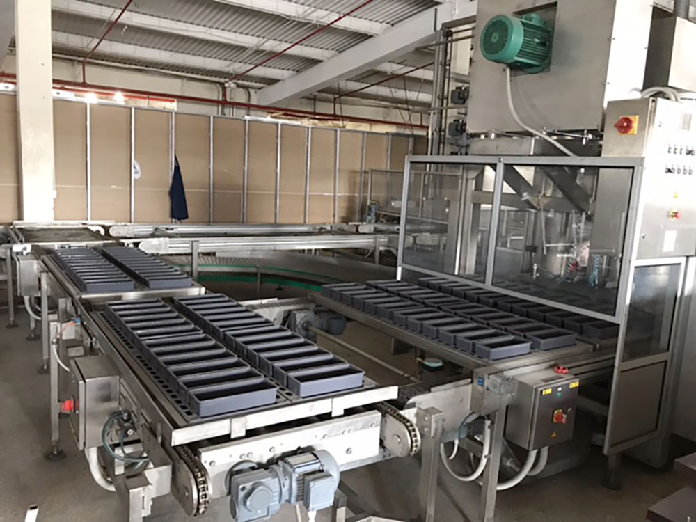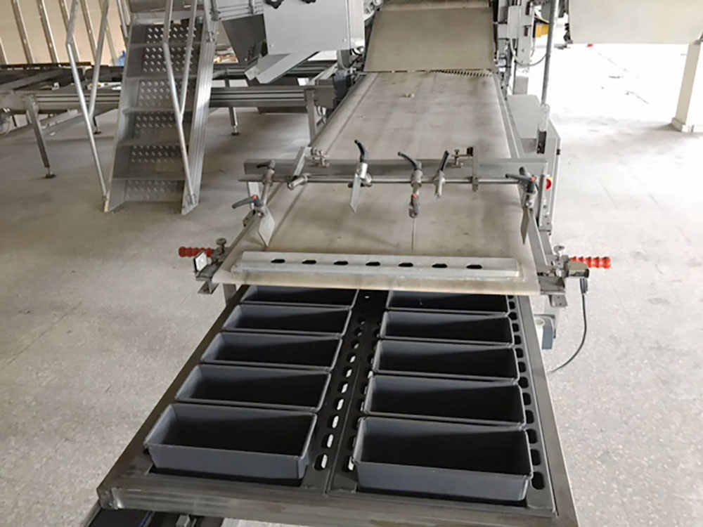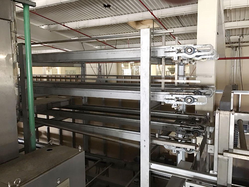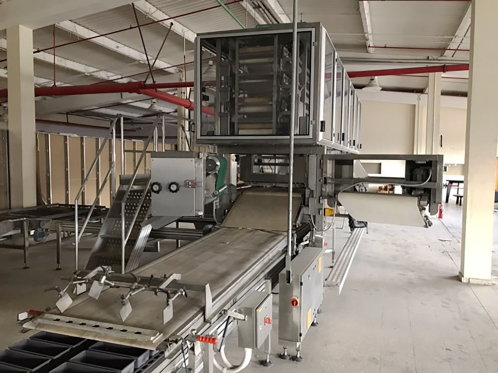 - Continuous conveyor system for the baking pans including storage, stoppers, curves etc.