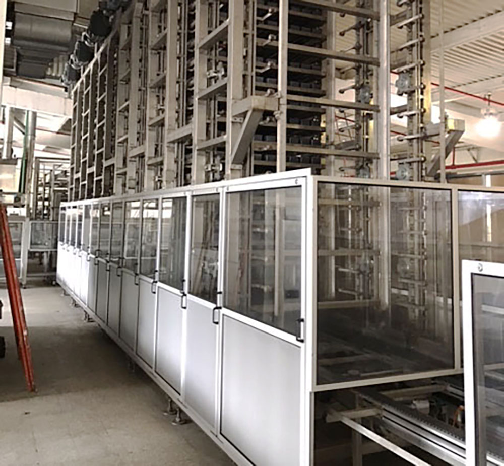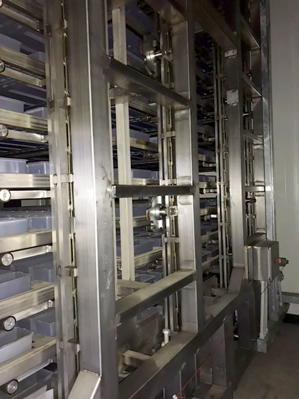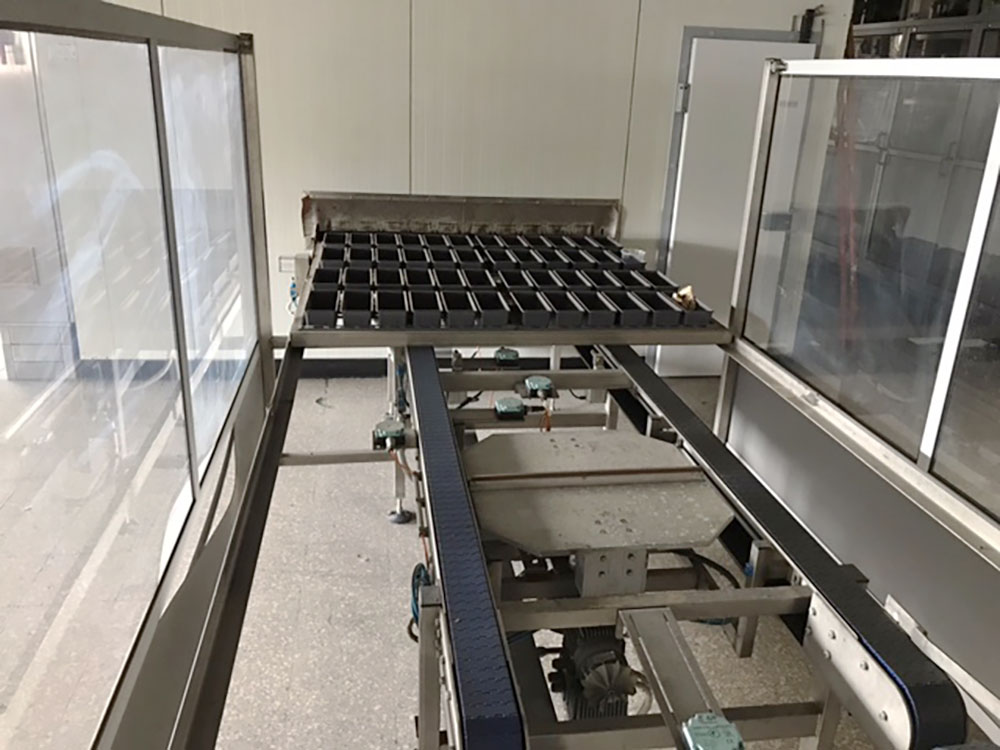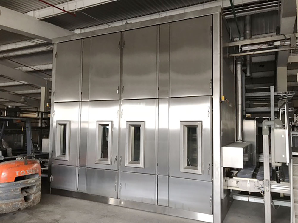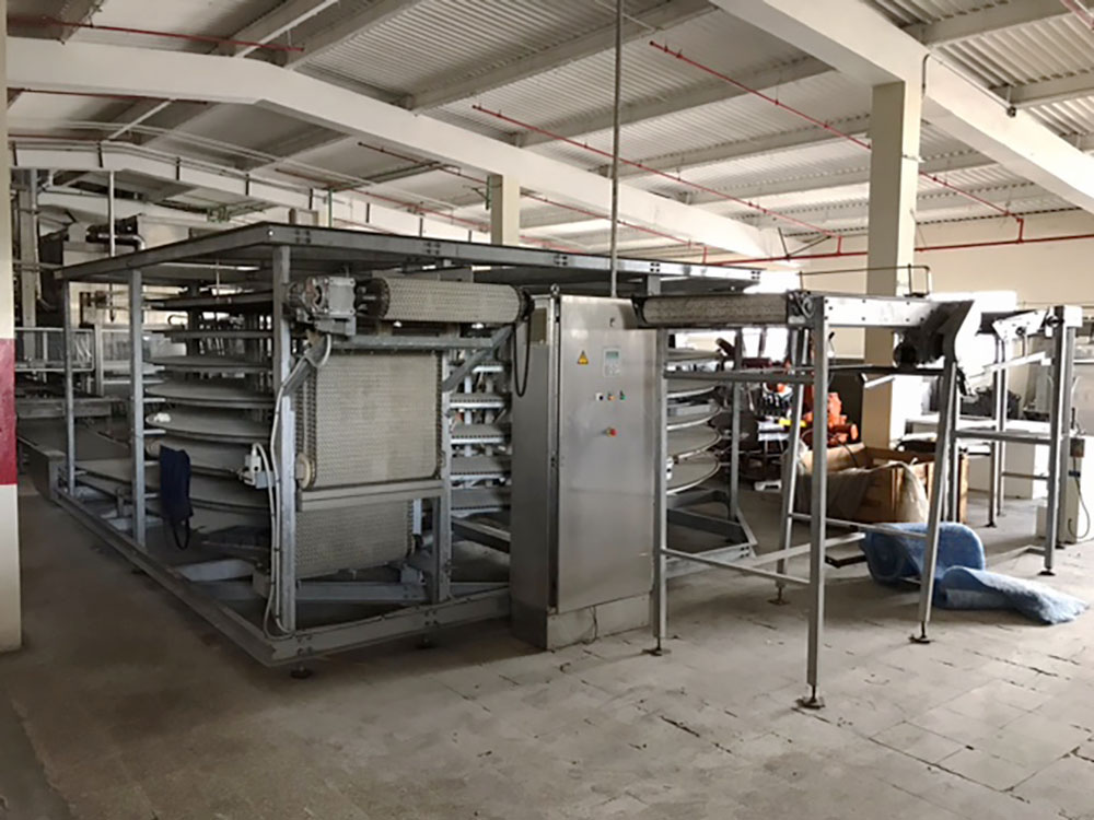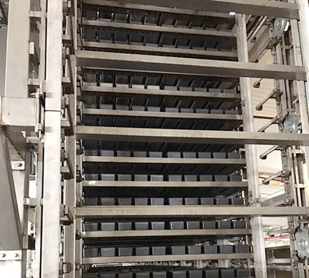 - Continuous conveyor system for the baking pans including storage, stoppers, curves etc.