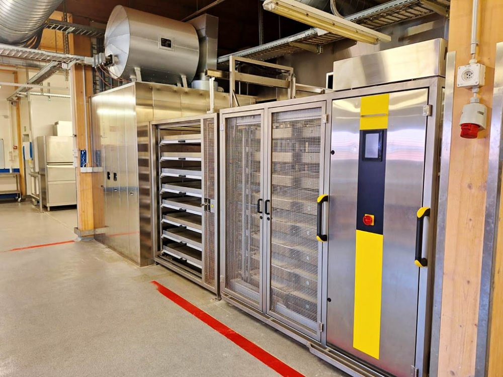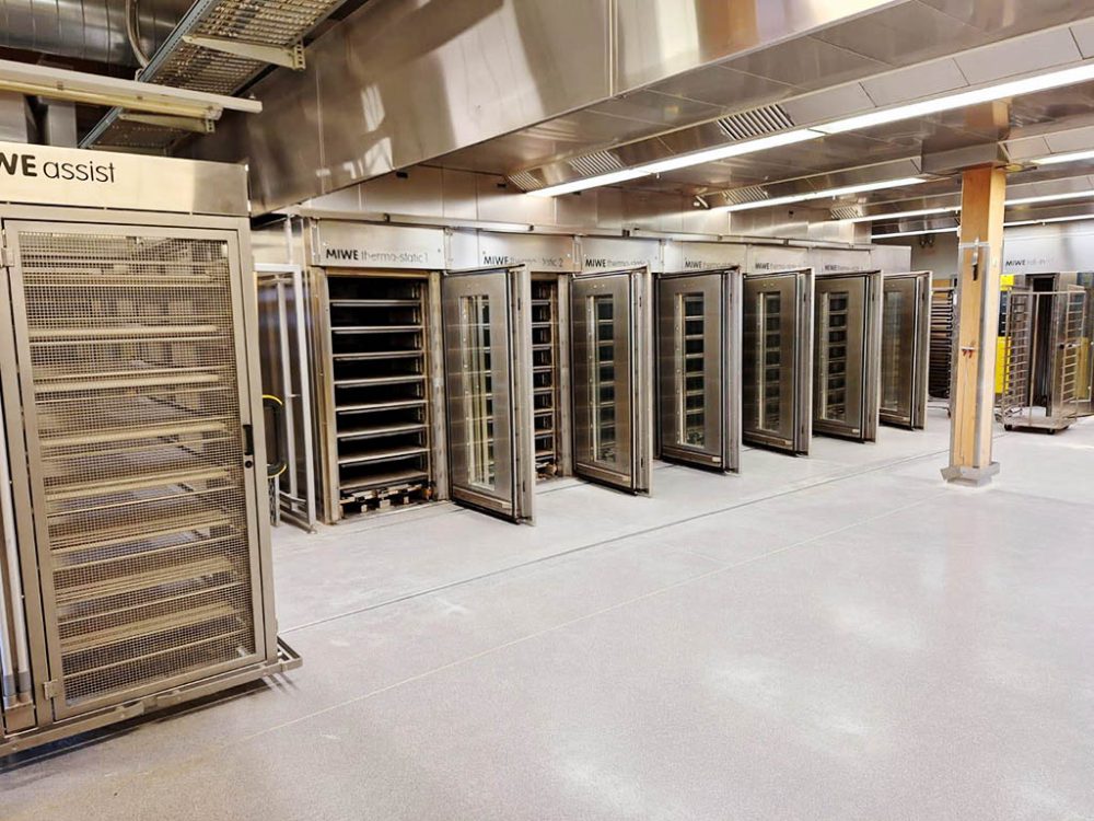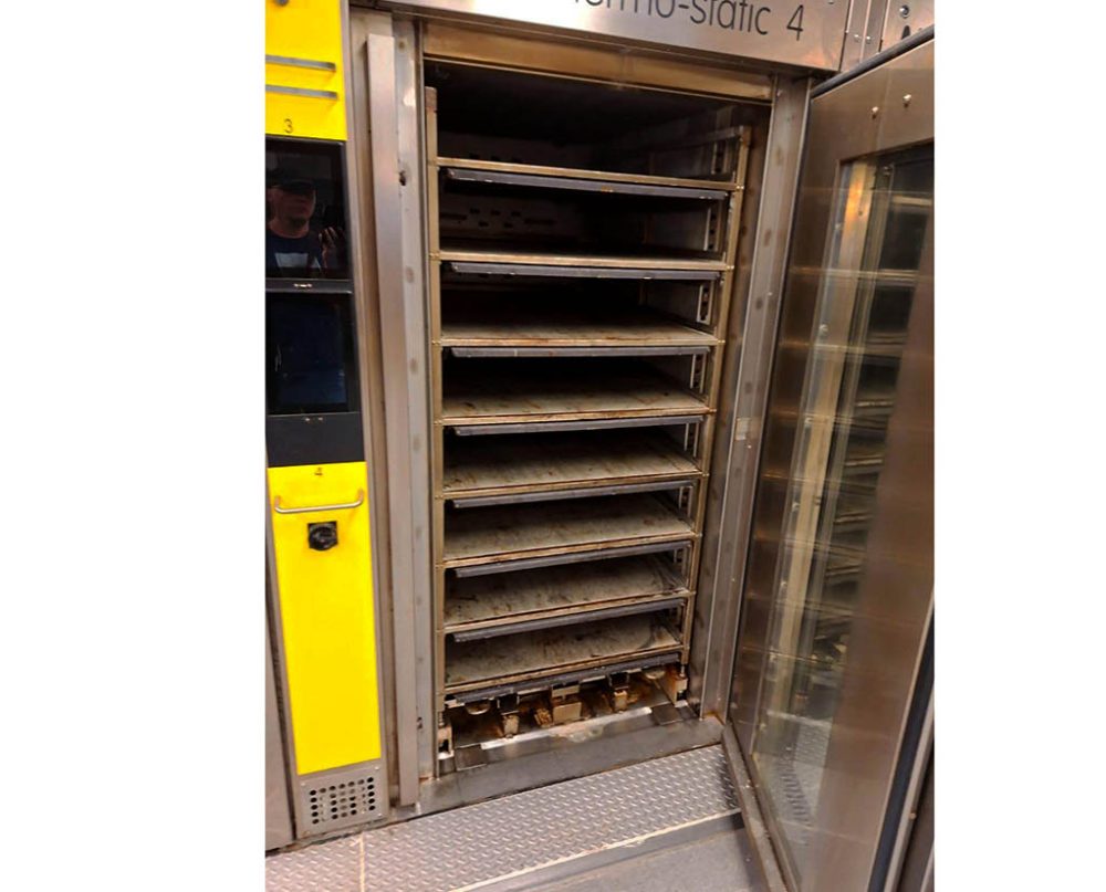 Unloading position for the MIWE Assist. The MIWE Assist places the baked breads in a special trolley were the breads need to be taken of manually.